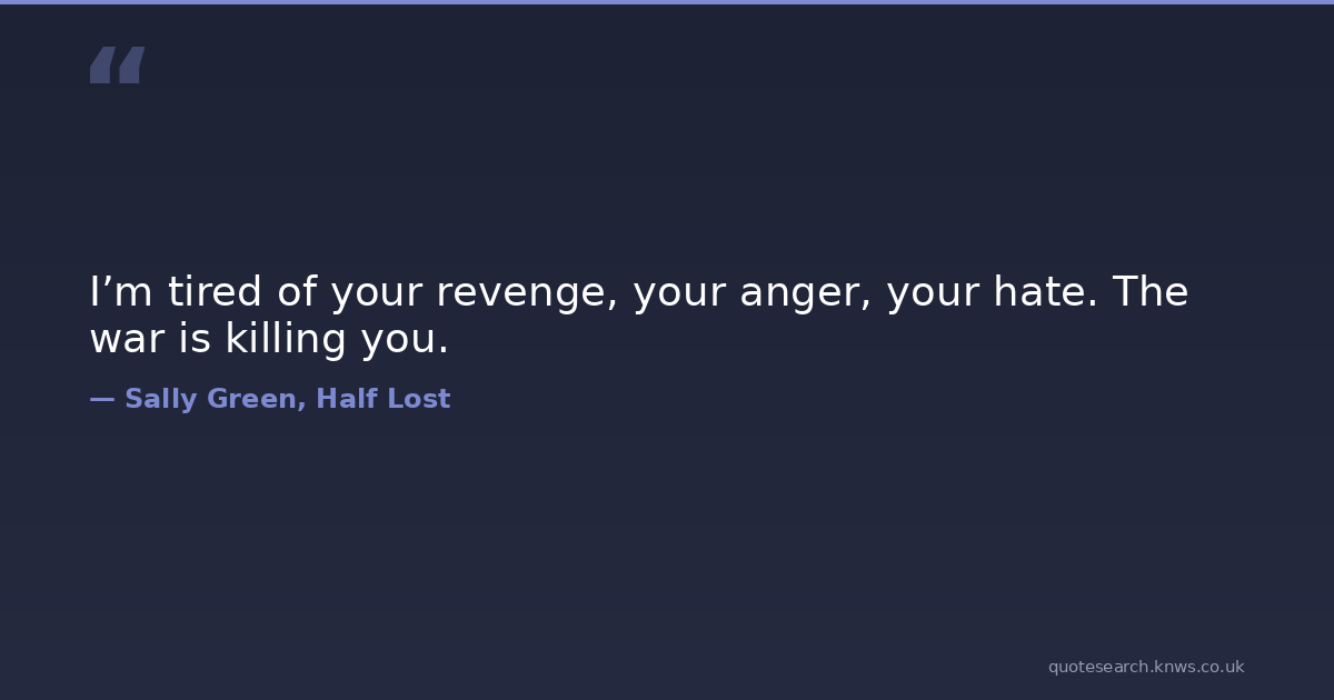 I’m tired of your revenge, your anger, your hate. The war is killing you. anger half-lost killing-myself revenge sally-green war Download Image Share on X Share on Facebook Copy Link