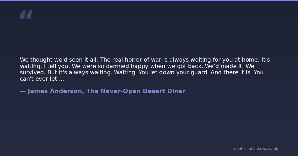 We thought we'd seen it all. The real horror of war is always waiting for you at home. It's waiting, I tell you. We were so damned happy when we got back. We'd made it. We survived. But it's always waiting. Waiting. You let down your guard. And there it is. You can't ever let up. Give up.
