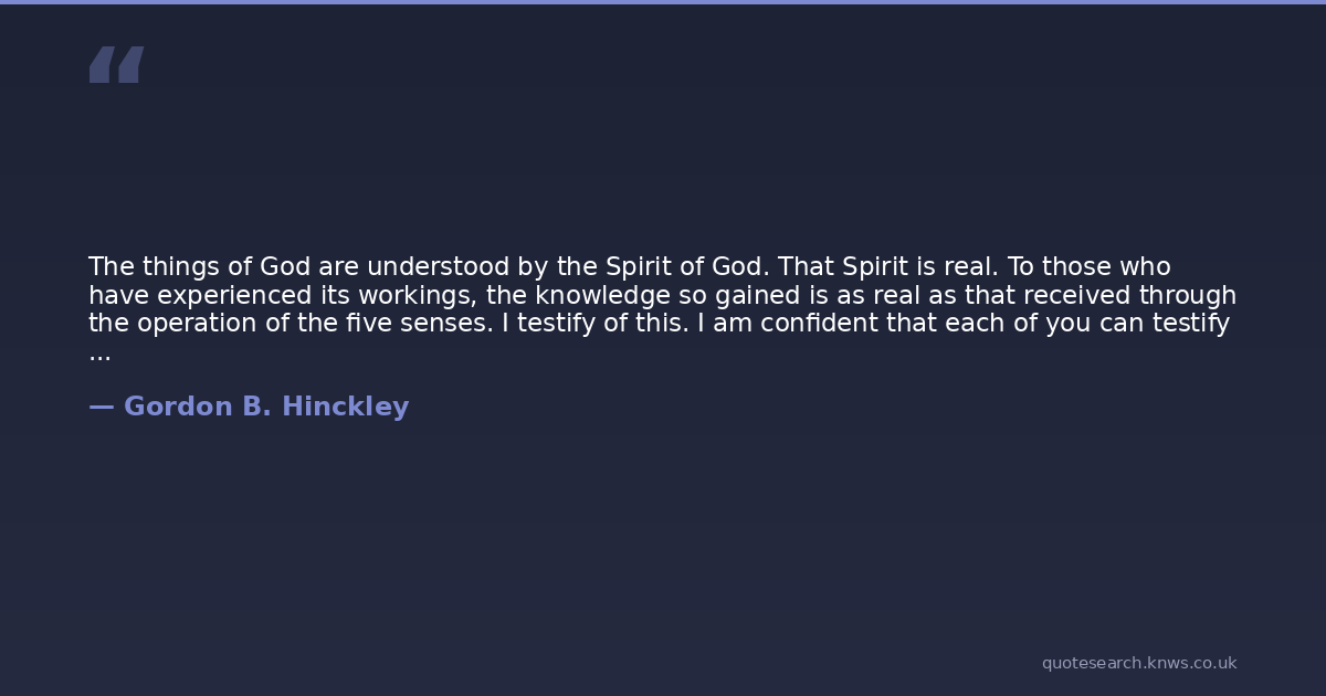 The things of God are understood by the Spirit of God. That Spirit is real. To those who have experienced its workings, the knowledge so gained is as real as that received through the operation of the five senses. I testify of this. I am confident that each of you can testify of it. I urge you to continue throughout your lives to cultivate a heart in tune with the Spirit. If you do so, your lives will be enriched. You will feel a kinship with God our Eternal Father. You will taste the sweetness of joy that can be had in no other way.