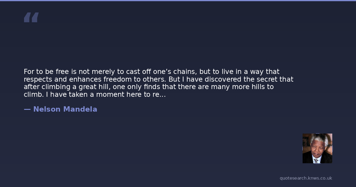 For to be free is not merely to cast off one’s chains, but to live in a way that respects and enhances freedom to others. But I have discovered the secret that after climbing a great hill, one only finds that there are many more hills to climb. I have taken a moment here to rest, to steal a view of the glorious vista that surrounds me, to look back on the distance I have come. But I rest only for a moment, for with freedom come responsibilities, and I dare not linger, for my long walk is not yet ended.