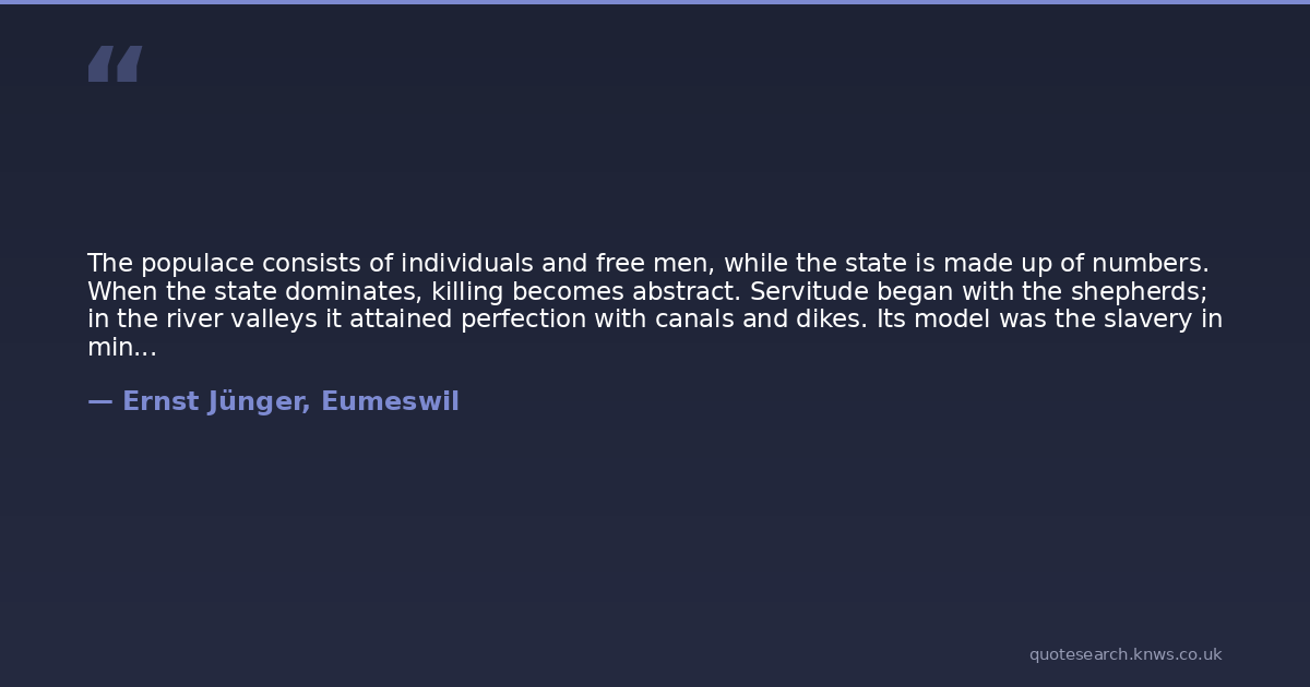 The populace consists of individuals and free men, while the state is made up of numbers. When the state dominates, killing becomes abstract. Servitude began with the shepherds; in the river valleys it attained perfection with canals and dikes. Its model was the slavery in mines and mills. Since then, the ruses for concealing chains have been refined.