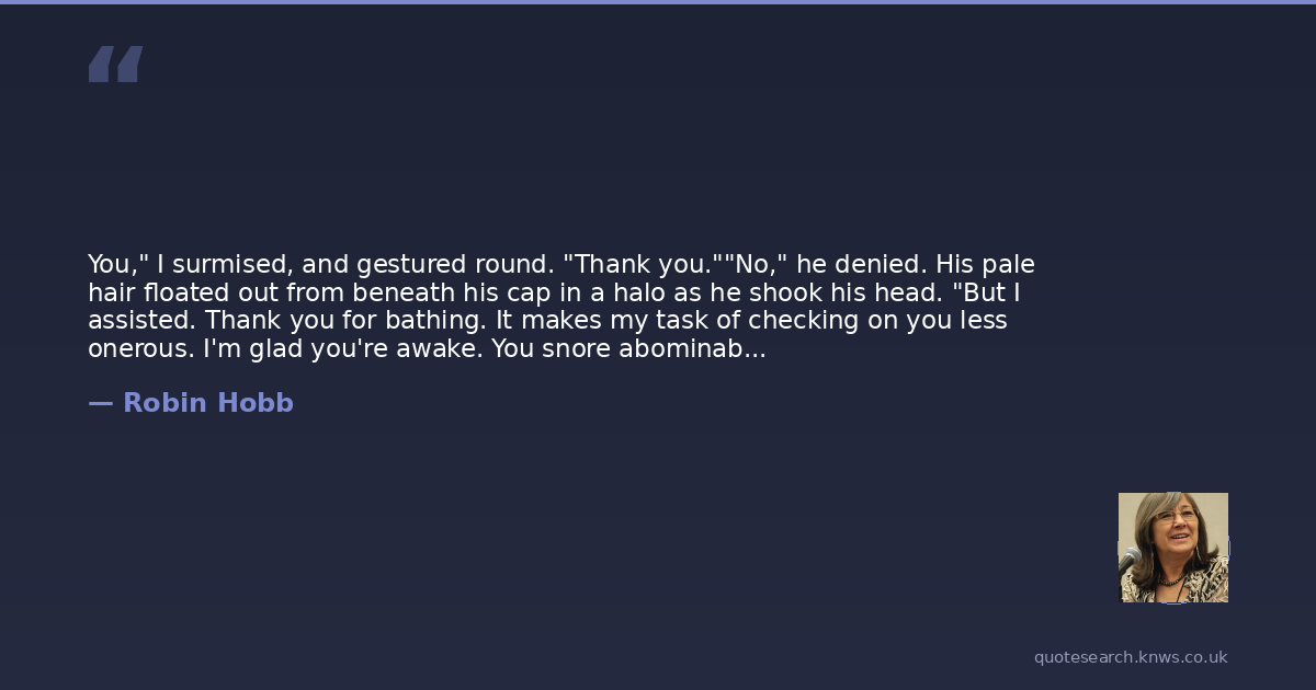 You," I surmised, and gestured round. "Thank you.""No," he denied. His pale hair floated out from beneath his cap in a halo as he shook his head. "But I assisted. Thank you for bathing. It makes my task of checking on you less onerous. I'm glad you're awake. You snore abominably."I let this comment pass. "You've grown." I observed. "Yes. So have you. And you've been sick. And you slept quite a long time. And now you're awake and bathed and fed. You still look terrible. But you no longer smell. It's late afternoon now. Are there any other obvious facts you'd like to review?