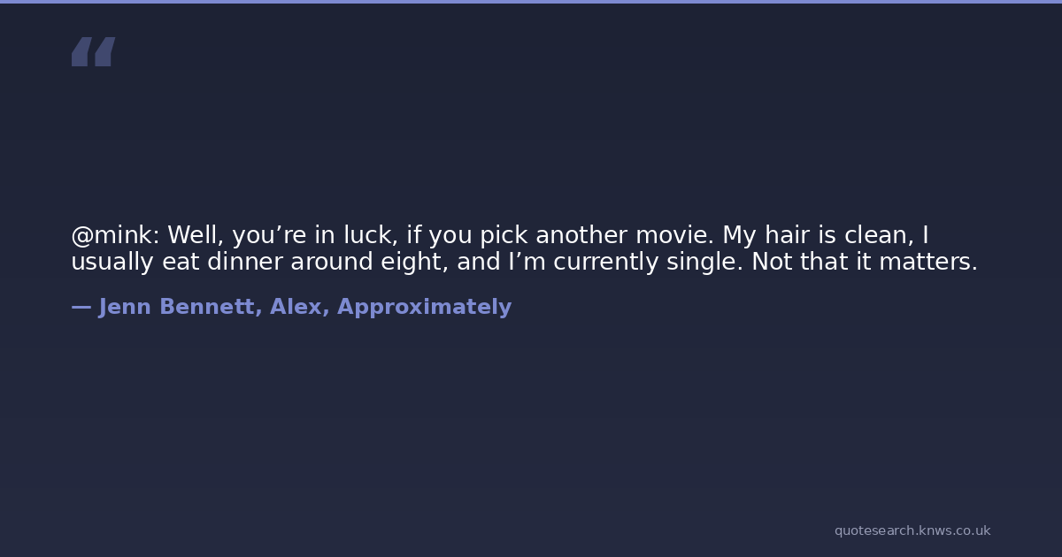 @mink: Well, you’re in luck, if you pick another movie. My hair is clean, I usually eat dinner around eight, and I’m currently single. Not that it matters.