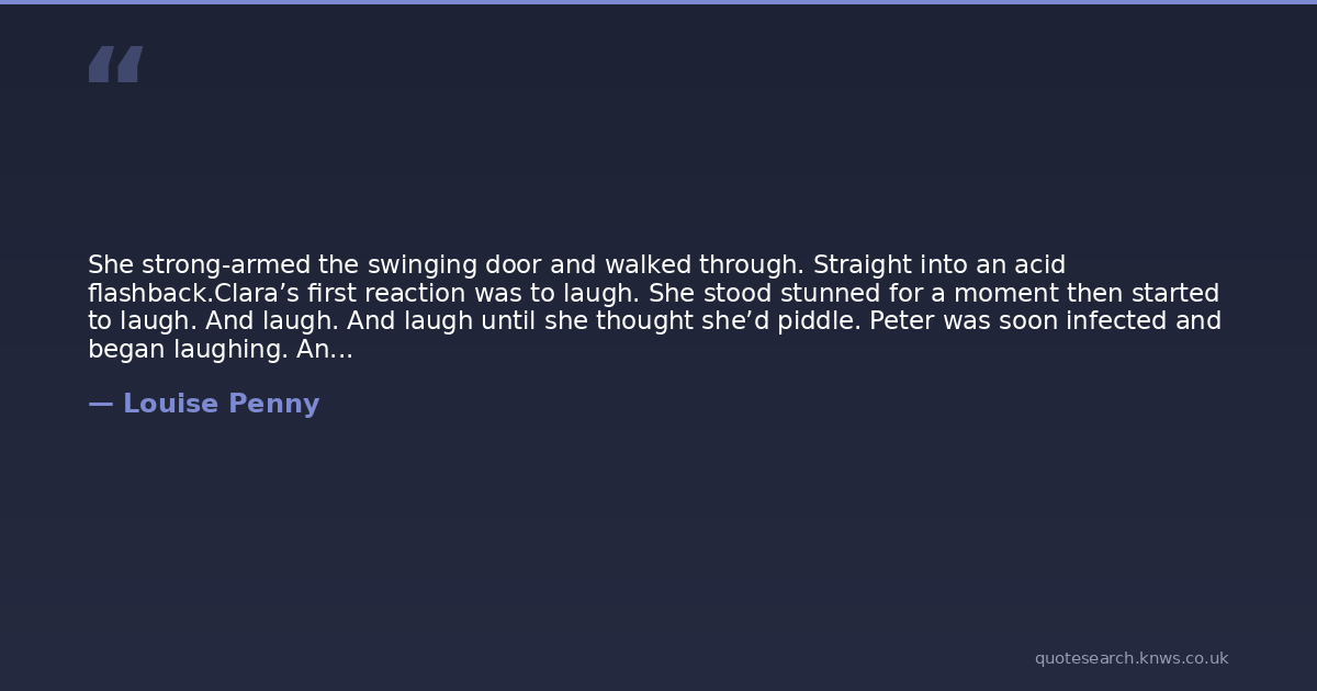 She strong-armed the swinging door and walked through. Straight into an acid flashback.Clara’s first reaction was to laugh. She stood stunned for a moment then started to laugh. And laugh. And laugh until she thought she’d piddle. Peter was soon infected and began laughing. And Gamache, who up until this moment had only seen a travesty, smiled, then chuckled, then laughed and within moments was laughing so hard he had to wipe away tears.‘Holy horrible taste, Batman,’ said Clara to Peter who doubled over, laughing some more.‘Solid, man, solid,’ he gasped and managed to raise a peace sign before having to put both hands on his knees to support his heaving body.