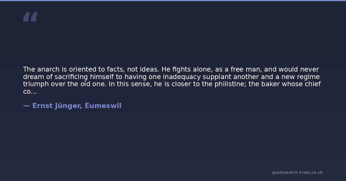 The anarch is oriented to facts, not ideas. He fights alone, as a free man, and would never dream of sacrificing himself to having one inadequacy supplant another and a new regime triumph over the old one. In this sense, he is closer to the philistine; the baker whose chief concern is to bake good bread; the peasant, who works his plow while armies march across his fields.