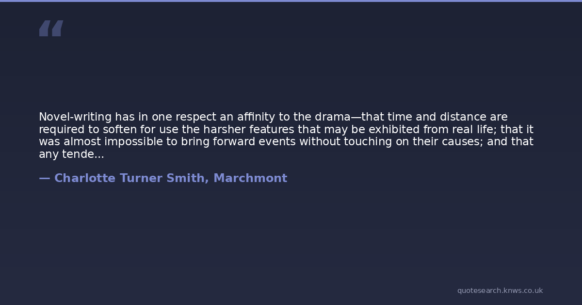 Novel-writing has in one respect an affinity to the drama—that time and distance are required to soften for use the harsher features that may be exhibited from real life; that it was almost impossible to bring forward events without touching on their causes; and that any tendency to political discussion, however liberal or applicable, was not to be tolerated in a sort of work which people took up with no other design than to be amused at the least possible expence of thought.