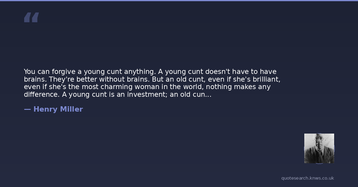 You can forgive a young cunt anything. A young cunt doesn't have to have brains. They're better without brains. But an old cunt, even if she's brilliant, even if she's the most charming woman in the world, nothing makes any difference. A young cunt is an investment; an old cunt is a dead loss. All they can do for you is buy you things. But that doesn't put meat on their arms or juice between their legs.