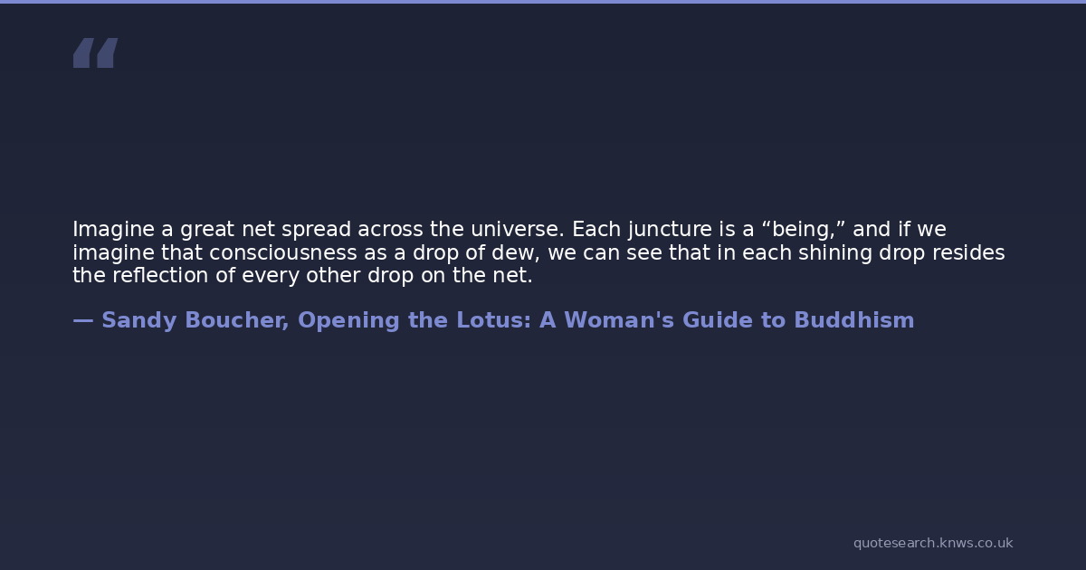 Imagine a great net spread across the universe. Each juncture is a “being,” and if we imagine that consciousness as a drop of dew, we can see that in each shining drop resides the reflection of every other drop on the net.