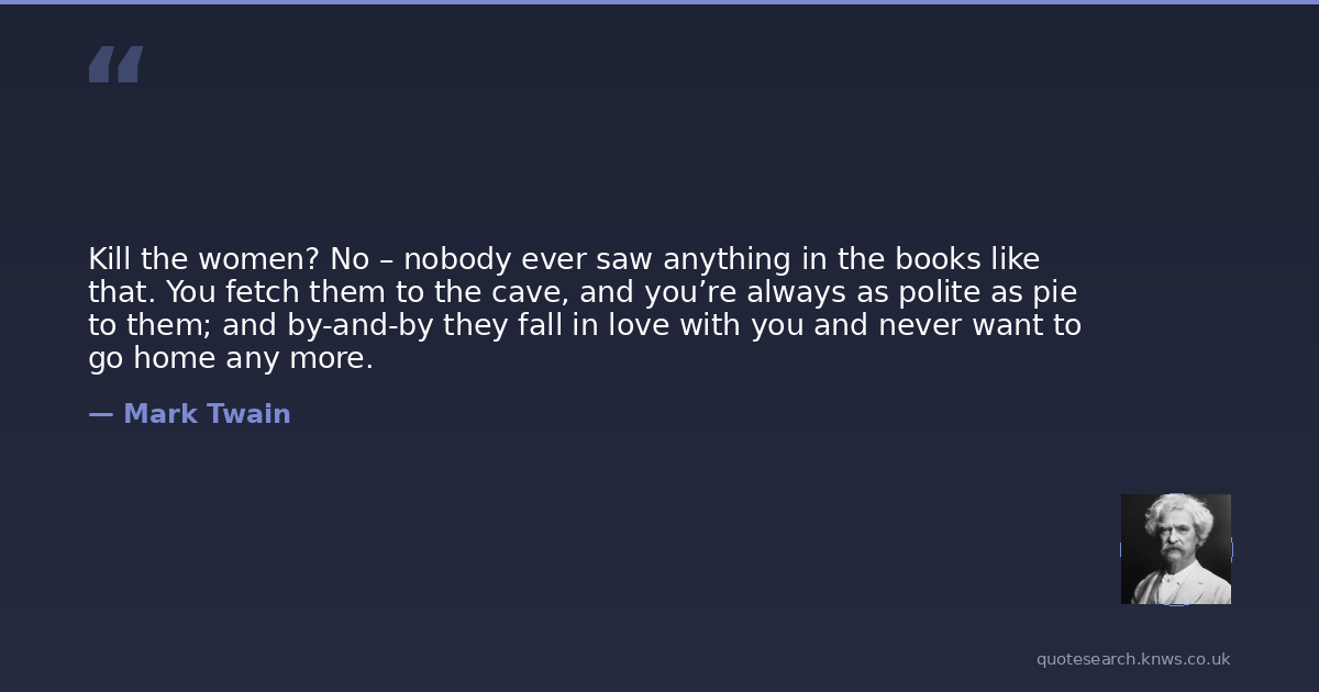 Kill the women? No – nobody ever saw anything in the books like that. You fetch them to the cave, and you’re always as polite as pie to them; and by-and-by they fall in love with you and never want to go home any more.