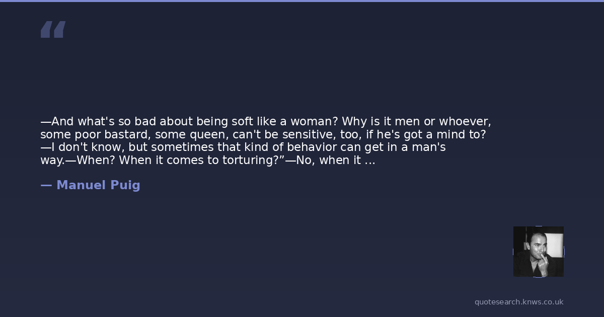 —And what's so bad about being soft like a woman? Why is it men or whoever, some poor bastard, some queen, can't be sensitive, too, if he's got a mind to? —I don't know, but sometimes that kind of behavior can get in a man's way.—When? When it comes to torturing?”—No, when it comes to being finished with the torturers.”—But if men acted like women there wouldn't be anymore torturers.