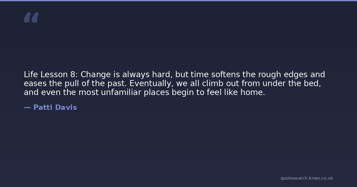 Life Lesson 8: Change is always hard, but time softens the rough edges and eases the pull of the past. Eventually, we all climb out from under the bed, and even the most unfamiliar places begin to feel like home.