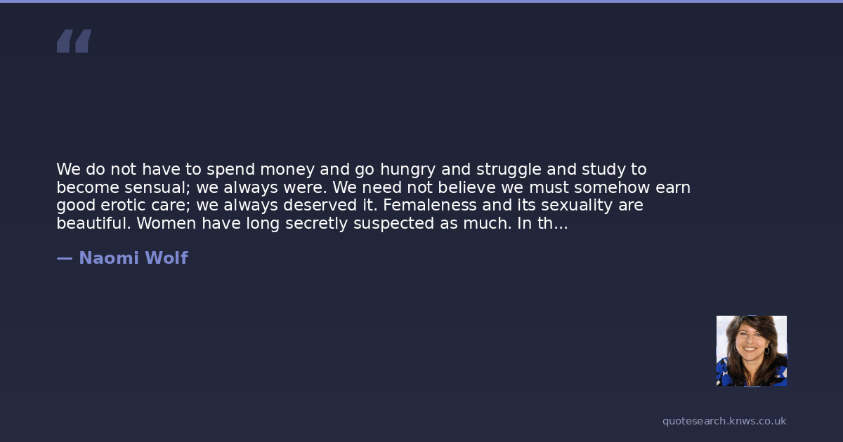 We do not have to spend money and go hungry and struggle and study to become sensual; we always were. We need not believe we must somehow earn good erotic care; we always deserved it. Femaleness and its sexuality are beautiful. Women have long secretly suspected as much. In that sexuality, women are physically beautiful already; superb; breathtaking.Many, many men see this way too. A man who wants to define himself as a real lover of women admires what shows of her past on a woman's face, before she ever saw him, and the adventures and stresses that her body has undergone, the scars of trauma, the changes of childbirth, her distinguishing characteristics, the light is her expression. The number of men who already see in this way is far greater than the arbiters of mass culture would lead us to believe, since the story they need to tell ends with the opposite moral.