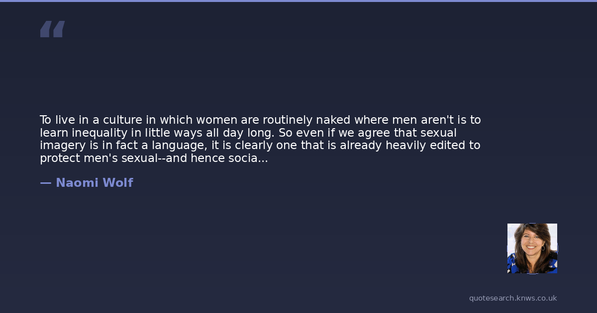 To live in a culture in which women are routinely naked where men aren't is to learn inequality in little ways all day long. So even if we agree that sexual imagery is in fact a language, it is clearly one that is already heavily edited to protect men's sexual--and hence social--confidence while undermining that of women.
