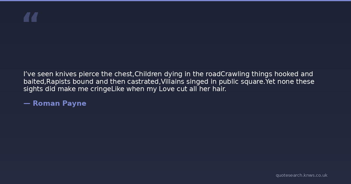 I’ve seen knives pierce the chest,Children dying in the roadCrawling things hooked and baited,Rapists bound and then castrated,Villains singed in public square.Yet none these sights did make me cringeLike when my Love cut all her hair.