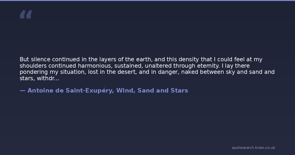 But silence continued in the layers of the earth, and this density that I could feel at my shoulders continued harmonious, sustained, unaltered through eternity. I lay there pondering my situation, lost in the desert, and in danger, naked between sky and sand and stars, withdrawn by too much silence from the poles of my life.