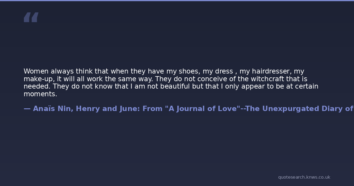 Women always think that when they have my shoes, my dress , my hairdresser, my make-up, it will all work the same way. They do not conceive of the witchcraft that is needed. They do not know that I am not beautiful but that I only appear to be at certain moments.