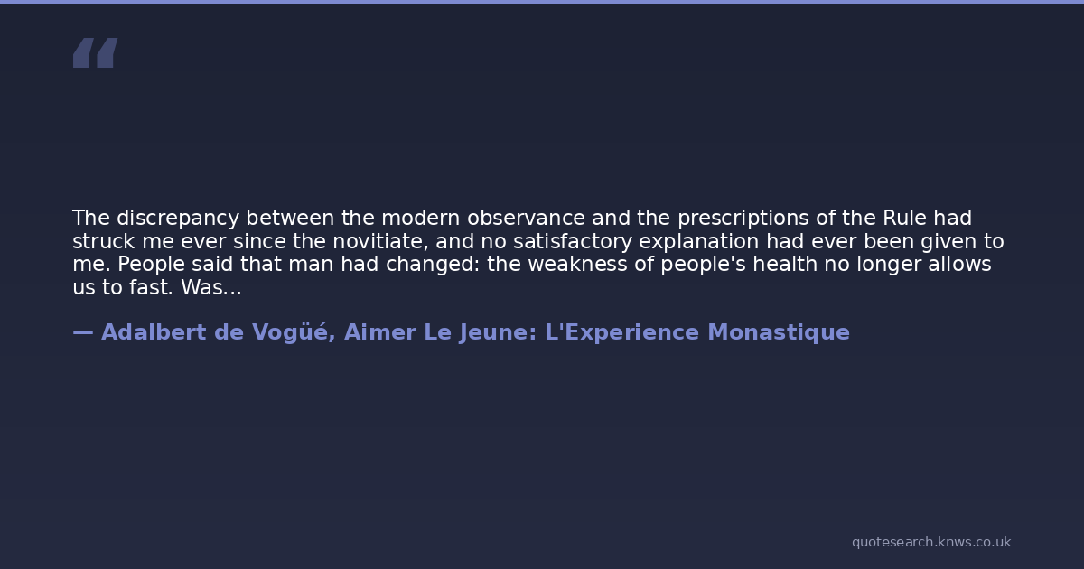 The discrepancy between the modern observance and the prescriptions of the Rule had struck me ever since the novitiate, and no satisfactory explanation had ever been given to me. People said that man had changed: the weakness of people's health no longer allows us to fast. Was it true?