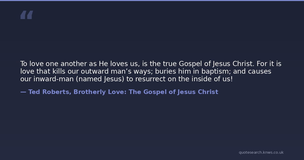 To love one another as He loves us, is the true Gospel of Jesus Christ. For it is love that kills our outward man’s ways; buries him in baptism; and causes our inward-man (named Jesus) to resurrect on the inside of us!