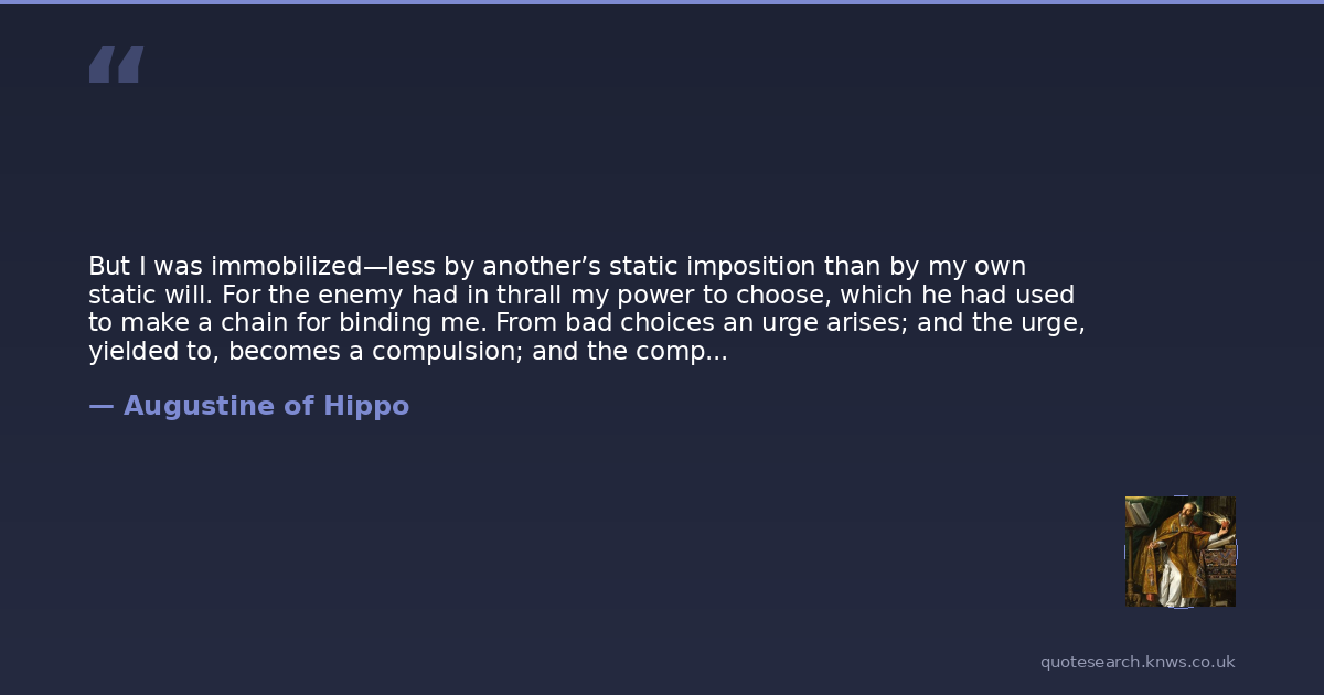 But I was immobilized—less by another’s static imposition than by my own static will. For the enemy had in thrall my power to choose, which he had used to make a chain for binding me. From bad choices an urge arises; and the urge, yielded to, becomes a compulsion; and the compulsion, unresisted, becomes a slavery—each link in this process connected with the others, which is why I call it a chain—and that chain had a tyrannical grip around me. The new will I felt stirring in me, a will to 'give you free worship' and enjoy what I yearned for, my God, my only reliable happiness, could not break away from the will made strong by long dominance. Two wills were mine, old and new, of the flesh, of the spirit, each warring on the other, and between their dissonances was my soul disintegrating.