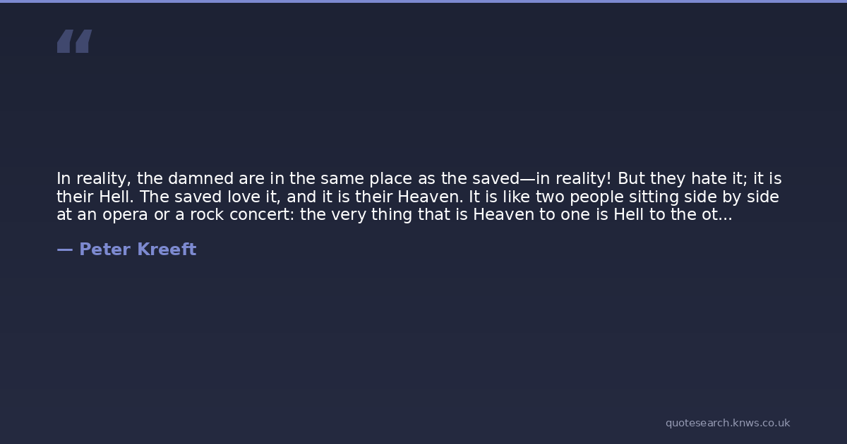 In reality, the damned are in the same place as the saved—in reality! But they hate it; it is their Hell. The saved love it, and it is their Heaven. It is like two people sitting side by side at an opera or a rock concert: the very thing that is Heaven to one is Hell to the other. Dostoyevski says, 'We are all in paradise, but we won’t see it'…Hell is not literally the 'wrath of God.' The love of God is an objective fact; the 'wrath of God' is a human projection of our own wrath upon God, as the Lady Julian saw—a disastrous misinterpretation of God’s love as wrath. God really says to all His creatures, 'I know you and I love you' but they hear Him saying, 'I never knew you; depart from me.' It is like angry children misinterpreting their loving parents’ affectionate advances as threats. They project their own hate onto their parents’ love and experience love as an enemy—which it is: an enemy to their egotistic defenses against joy…Since God is love, since love is the essence of the divine life, the consequence of loss of this life is loss of love...Though the damned do not love God, God loves them, and this is their torture. The very fires of Hell are made of the love of God! Love received by one who only wants to hate and fight thwarts his deepest want and is therefore torture. If God could stop loving the damned, Hell would cease to be pure torture. If the sun could stop shining, lovers of the dark would no longer be tortured by it. But the sun could sooner cease to shine than God cease to be God...The lovelessness of the damned blinds them to the light of glory in which they stand, the glory of God’s fire. God is in the fire that to them is Hell. God is in Hell ('If I make my bed in Hell, Thou art there' [Ps 139:8]) but the damned do not know Him.