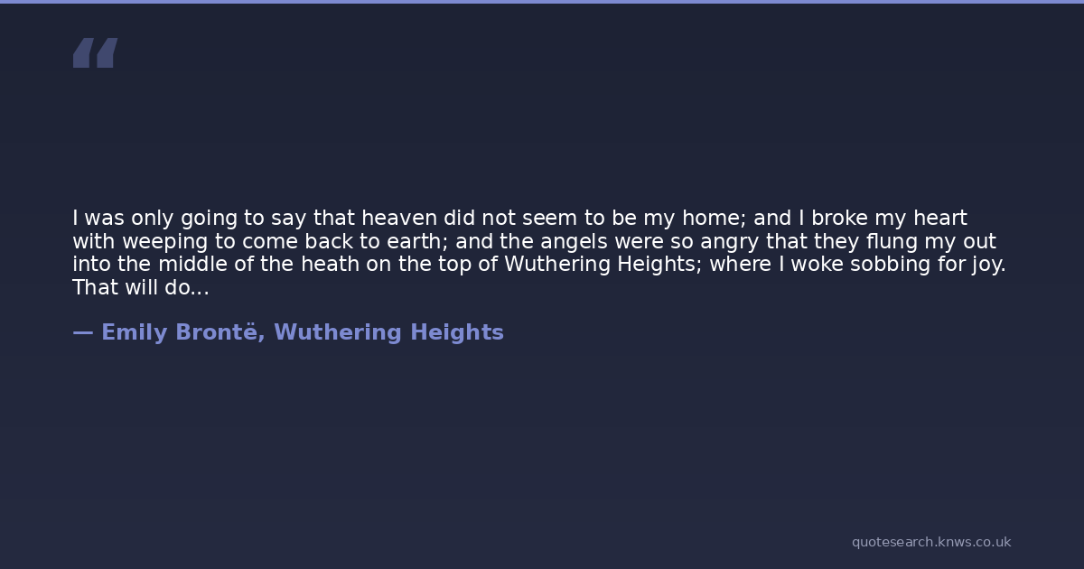 I was only going to say that heaven did not seem to be my home; and I broke my heart with weeping to come back to earth; and the angels were so angry that they flung my out into the middle of the heath on the top of Wuthering Heights; where I woke sobbing for joy. That will do to explain my secret, as well as the other. I've no more business to marry Edgar Linton than I have to be in heaven; and if the wicked man in there had not brought Heathcliff so low, I shouldn't have thought of it. It would degrade me to marry Heathcliff now; so he shall never know how I love him: and that, not because he's handsome, but because he's more myself than I am. What ever our souls are made of, his and mine are the same; and Linton's is as different as a moonbeam from lightning, or frost from fire.'Ere this speech ended, I became sensible of Heathcliff's presence. Having noticed a slight movement, I turned my head, and saw him rise from the bench, and steal out noiselessly. He had listened till he heard Catherine say it would degrade her to marry him, and then he stayed to hear no further.