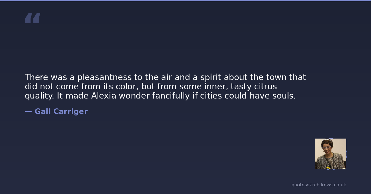 There was a pleasantness to the air and a spirit about the town that did not come from its color, but from some inner, tasty citrus quality. It made Alexia wonder fancifully if cities could have souls.