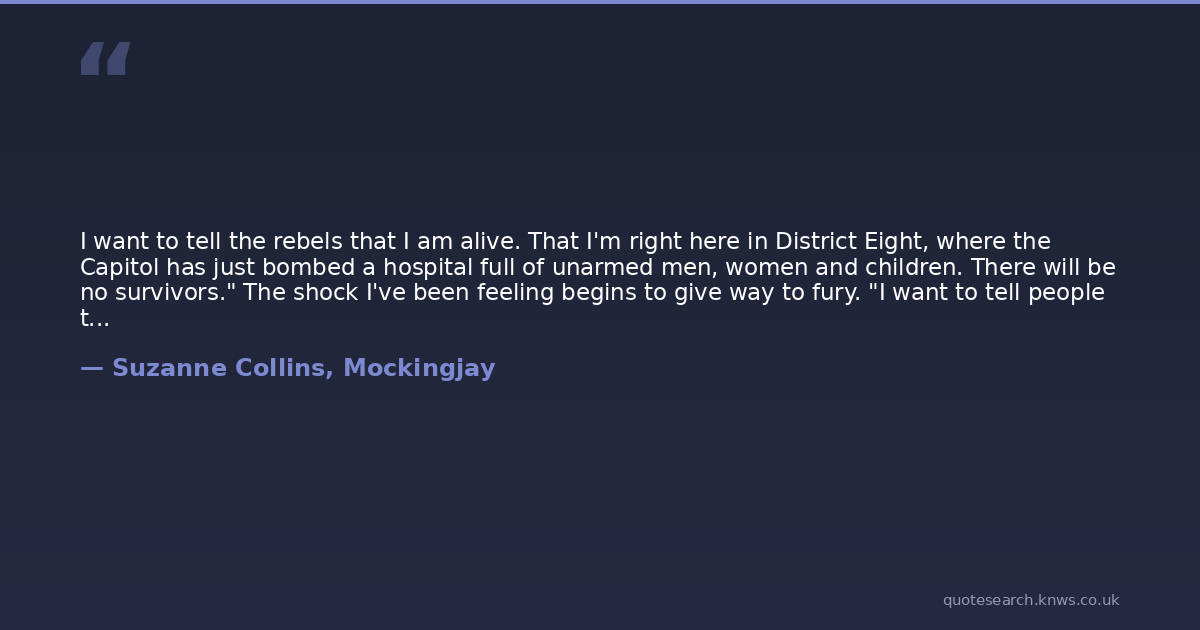 I want to tell the rebels that I am alive. That I'm right here in District Eight, where the Capitol has just bombed a hospital full of unarmed men, women and children. There will be no survivors." The shock I've been feeling begins to give way to fury. "I want to tell people that if you think for one second the Capitol will treat us fairly if there's a cease-fire, you're deluding yourself. Because you know who they are and what they do." My hands go out automatically, as if to indicate the whole horror around me. "This is what they do and we must fight back!""President Snow says he's sending a message. Well I have one for him. You can torture us and bomb and burn our districts to the ground, but do you see that?" One of the cameras follows where I point to the planes burning on the roof of a warehouse across from us. "Fire is catching!" I am shouting now, determined he will not miss a word of it, "And if we burn, you burn with us!