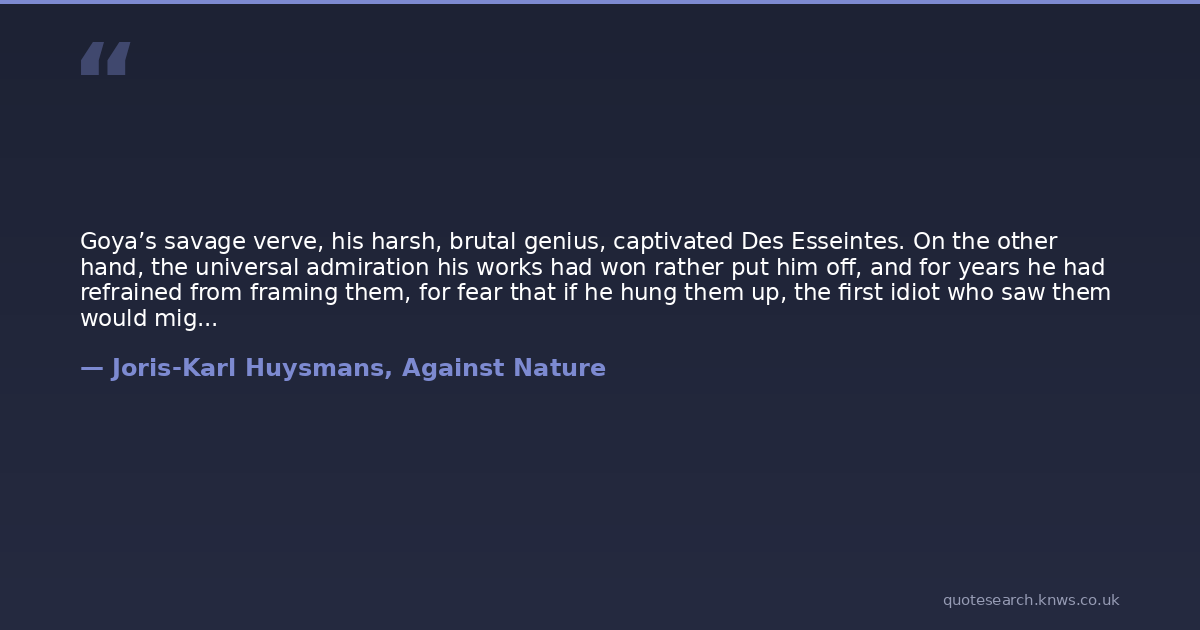 Goya’s savage verve, his harsh, brutal genius, captivated Des Esseintes. On the other hand, the universal admiration his works had won rather put him off, and for years he had refrained from framing them, for fear that if he hung them up, the first idiot who saw them would might feel obliged to dishonour them with a few inanities and go into stereotyped ecstasies over them.