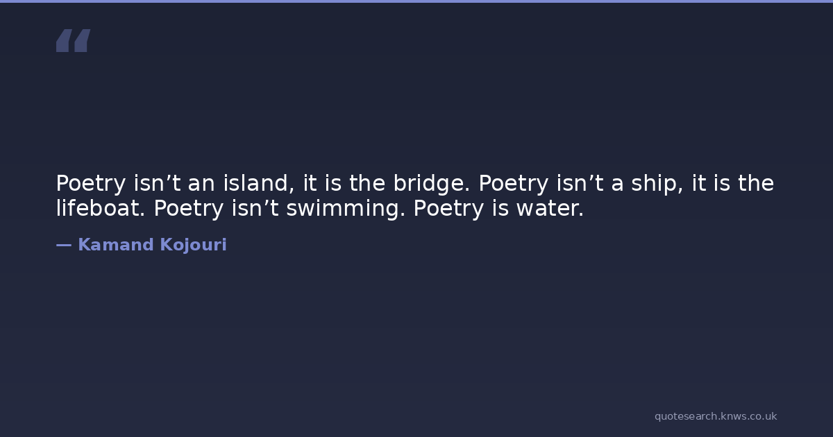 Poetry isn’t an island, it is the bridge. Poetry isn’t a ship, it is the lifeboat. Poetry isn’t swimming. Poetry is water.