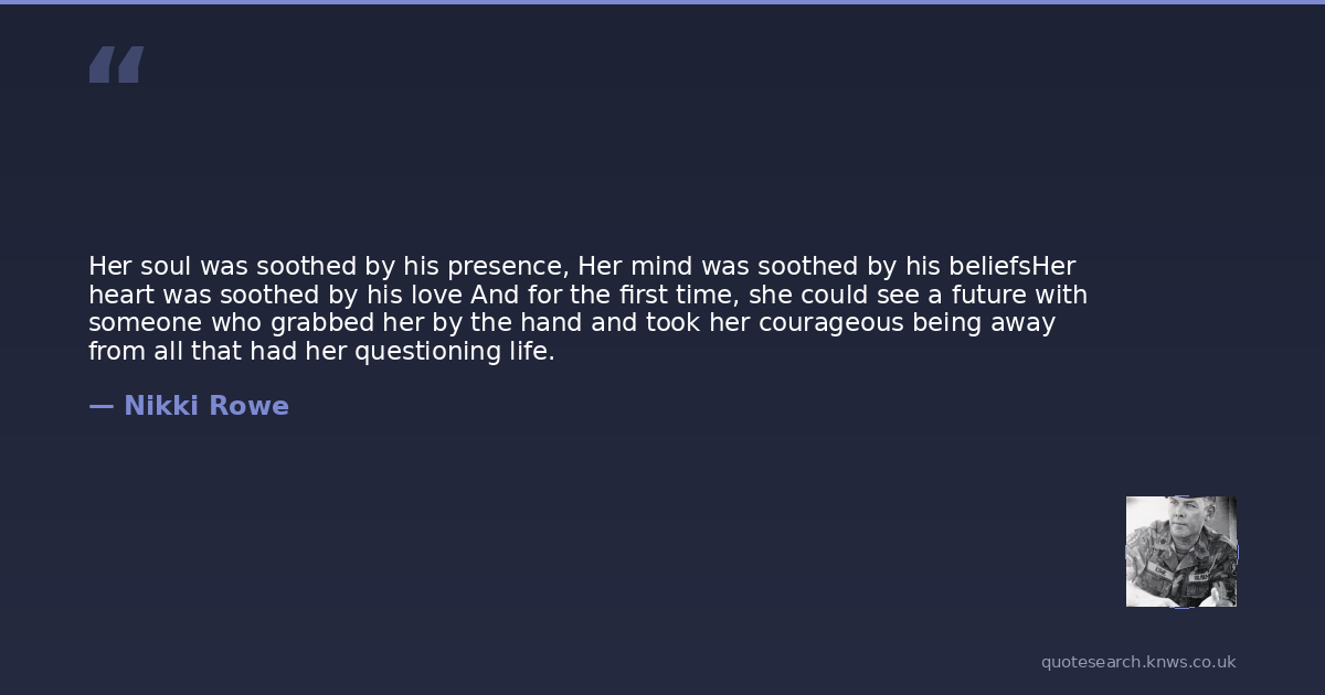 Her soul was soothed by his presence, Her mind was soothed by his beliefsHer heart was soothed by his love And for the first time, she could see a future with someone who grabbed her by the hand and took her courageous being away from all that had her questioning life.