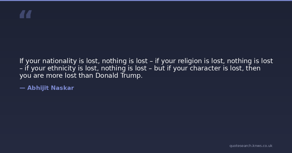 If your nationality is lost, nothing is lost – if your religion is lost, nothing is lost – if your ethnicity is lost, nothing is lost – but if your character is lost, then you are more lost than Donald Trump.