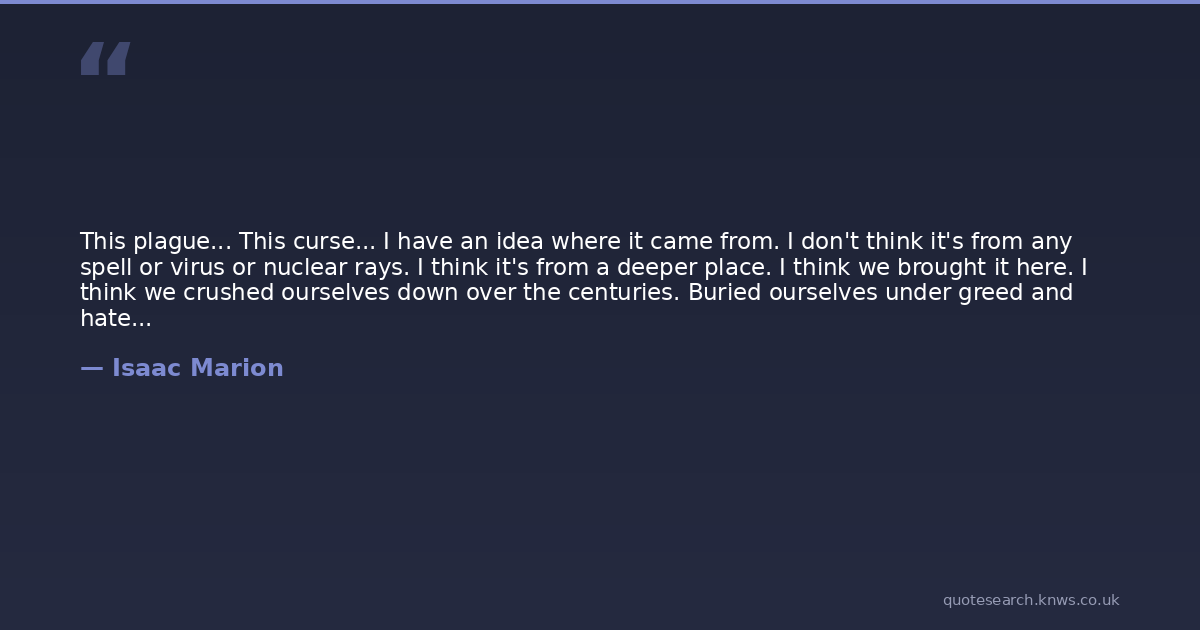 This plague... This curse... I have an idea where it came from. I don't think it's from any spell or virus or nuclear rays. I think it's from a deeper place. I think we brought it here. I think we crushed ourselves down over the centuries. Buried ourselves under greed and hate and whatever other sins we could find until our souls finally hit the rock bottom of the universe. And then they scraped a hole through it, into some... dark place. We released it. We poked through the seabed and the oil erupted, painted us black, pulled our inner sickness out for everyone to see. Now here we are in this dry corpse of a world, rotting on our feet till there's nothing left but bones and the buzz of flies.
