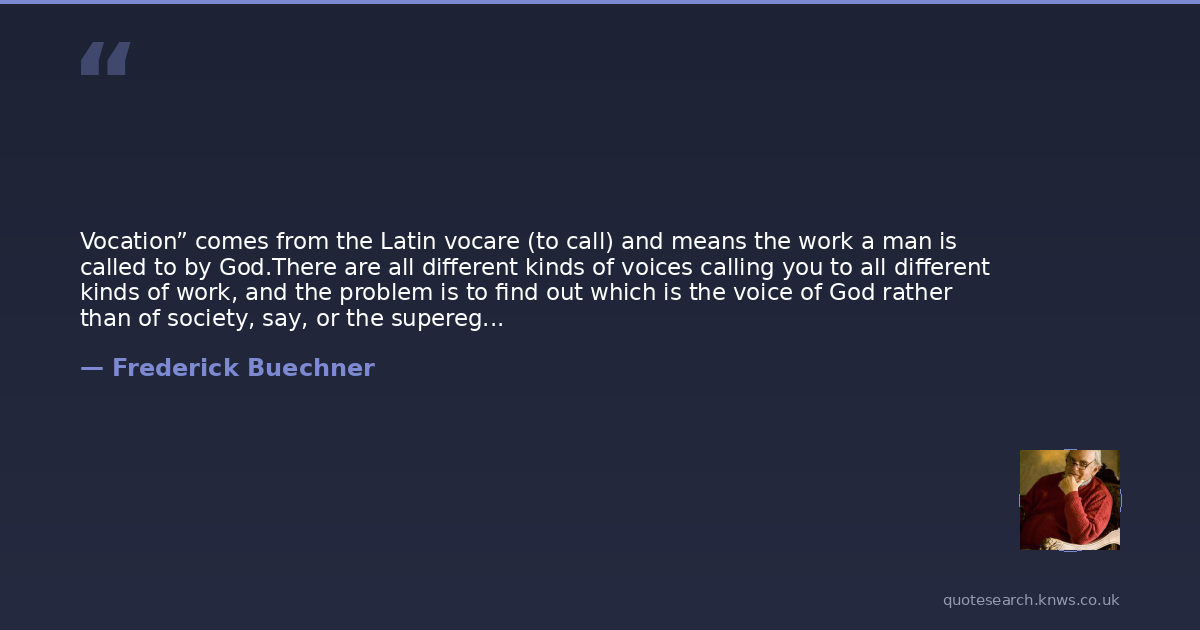 Vocation” comes from the Latin vocare (to call) and means the work a man is called to by God.There are all different kinds of voices calling you to all different kinds of work, and the problem is to find out which is the voice of God rather than of society, say, or the superego, or self-interest.The kind of work God usually calls you to is the kind of work (a) that you need to do and (b) that the world needs to have done. If you find your work rewarding, you have presumably met requirement (a), but if your work does not benefit others, the chances are you have missed requirement (b). On the other hand, if your work does benefit others, you have probably met requirement (b), but if most of the time you are unhappy with it, the chances are you have not only bypassed (a) but probably aren’t helping your customers much either.Neither the hair shirt nor the soft berth will do. The place God calls you to is the place where your deep gladness and the world’s hunger meet.