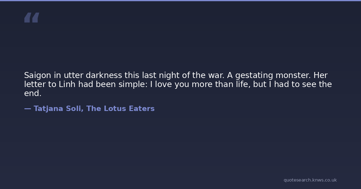 Saigon in utter darkness this last night of the war. A gestating monster. Her letter to Linh had been simple: I love you more than life, but I had to see the end.
