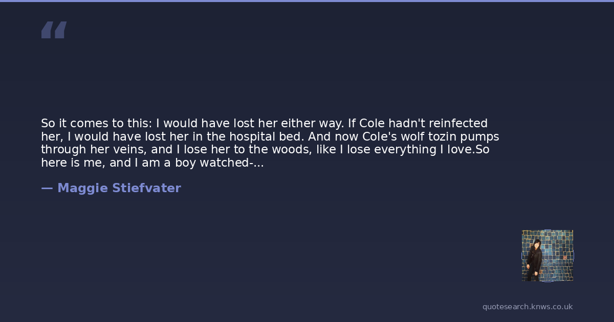 So it comes to this: I would have lost her either way. If Cole hadn't reinfected her, I would have lost her in the hospital bed. And now Cole's wolf tozin pumps through her veins, and I lose her to the woods, like I lose everything I love.So here is me, and I am a boy watched--by her parents' suspicious eyes, since they cannot prove that I kidnapped Grace but believe nonetheless--and I am a boy watchful--because Tom Culpeper's bitterness is growing palpable in this tiny town and I will NOT bury Grace's body--and I am a boy waiting--for the heat and the fruitfulness of summer, waiting to see who will walk out of those woods for me. Waiting for my lovely summer girl.