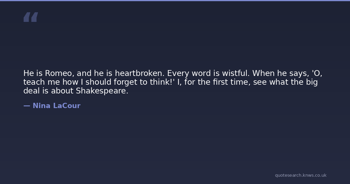 He is Romeo, and he is heartbroken. Every word is wistful. When he says, 'O, teach me how I should forget to think!' I, for the first time, see what the big deal is about Shakespeare.
