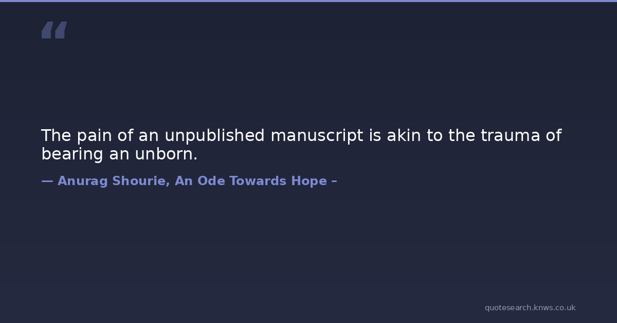 The pain of an unpublished manuscript is akin to the trauma of bearing an unborn. manuscript manuscript-quotes pain pain-quotes publish publishing publishing-books publishing-humor publishing-industry publishing-novels trauma unborn Download Image Share on X Share on Facebook Copy Link