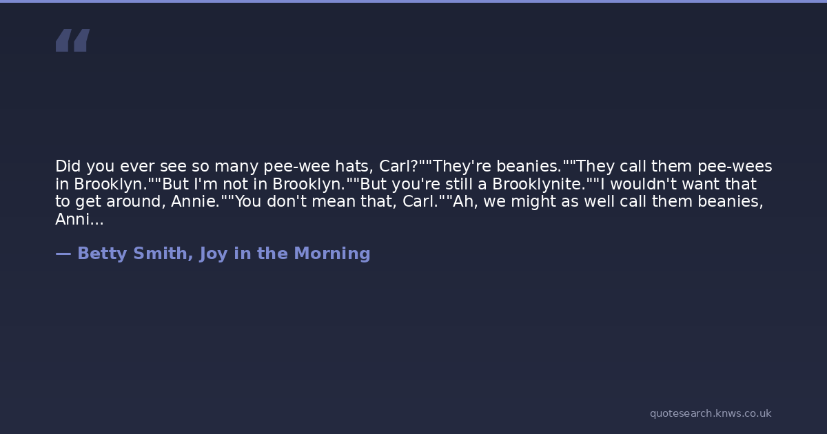 Did you ever see so many pee-wee hats, Carl?""They're beanies.""They call them pee-wees in Brooklyn.""But I'm not in Brooklyn.""But you're still a Brooklynite.""I wouldn't want that to get around, Annie.""You don't mean that, Carl.""Ah, we might as well call them beanies, Annie.""Why?""When in Rome do as the Romans do.""Do they call them beanies in Rome?" she asked artlessly."This is the silliest conversation...