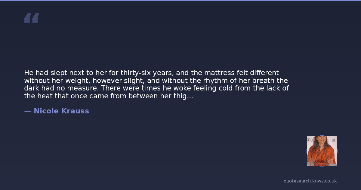 He had slept next to her for thirty-six years, and the mattress felt different without her weight, however slight, and without the rhythm of her breath the dark had no measure. There were times he woke feeling cold from the lack of the heat that once came from between her thighs and behind her knees. He might have even called her, if he could have momentarily forgotten that he already knew everything she could possibly say.