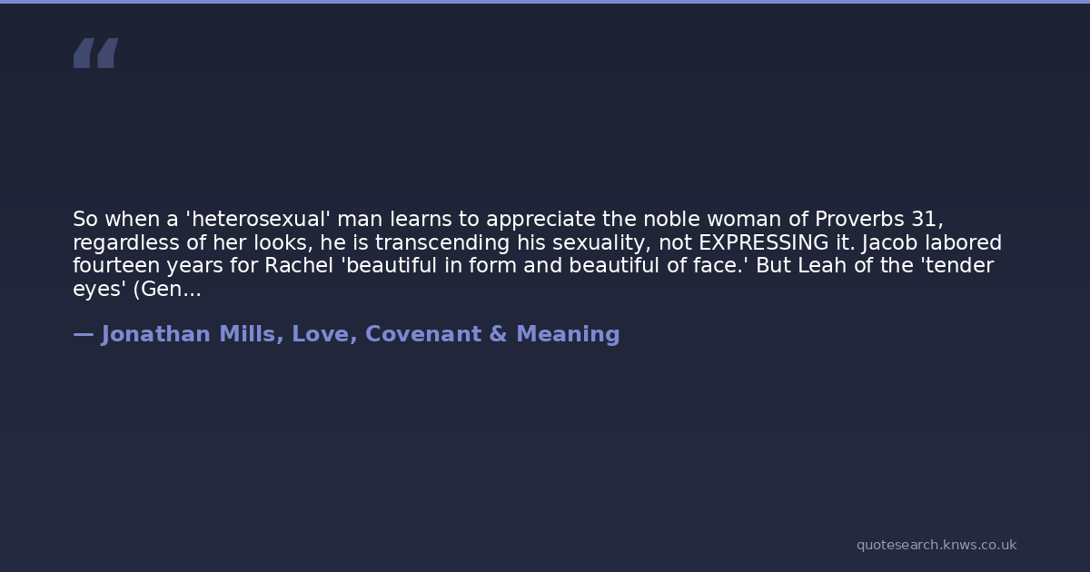 So when a 'heterosexual' man learns to appreciate the noble woman of Proverbs 31, regardless of her looks, he is transcending his sexuality, not EXPRESSING it. Jacob labored fourteen years for Rachel 'beautiful in form and beautiful of face.' But Leah of the 'tender eyes' (Gen. 29:17) proved a much better and nobler wife. Perhaps a 'homosexual' man - a man whose venereal desires are focused more on men than on women - would not have been distracted by Rachel's looks and could have seen Leah's goodness and nobility from the beginning, as Jacob did not (29:30f). Biblically, the dwindling of such desire is not grounds for divorce (Mal. 2:14-16).