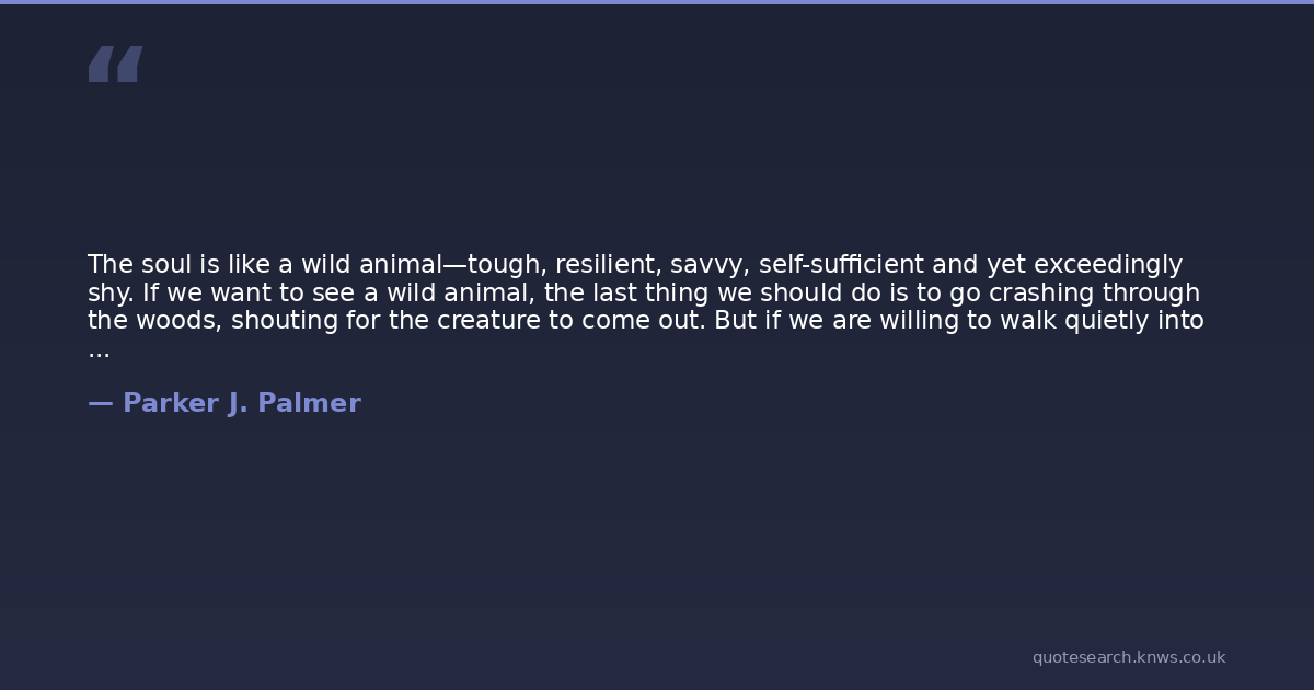 The soul is like a wild animal—tough, resilient, savvy, self-sufficient and yet exceedingly shy. If we want to see a wild animal, the last thing we should do is to go crashing through the woods, shouting for the creature to come out. But if we are willing to walk quietly into the woods and sit silently for an hour or two at the base of a tree, the creature we are waiting for may well emerge, and out of the corner of an eye we will catch a glimpse of the precious wildness we seek.