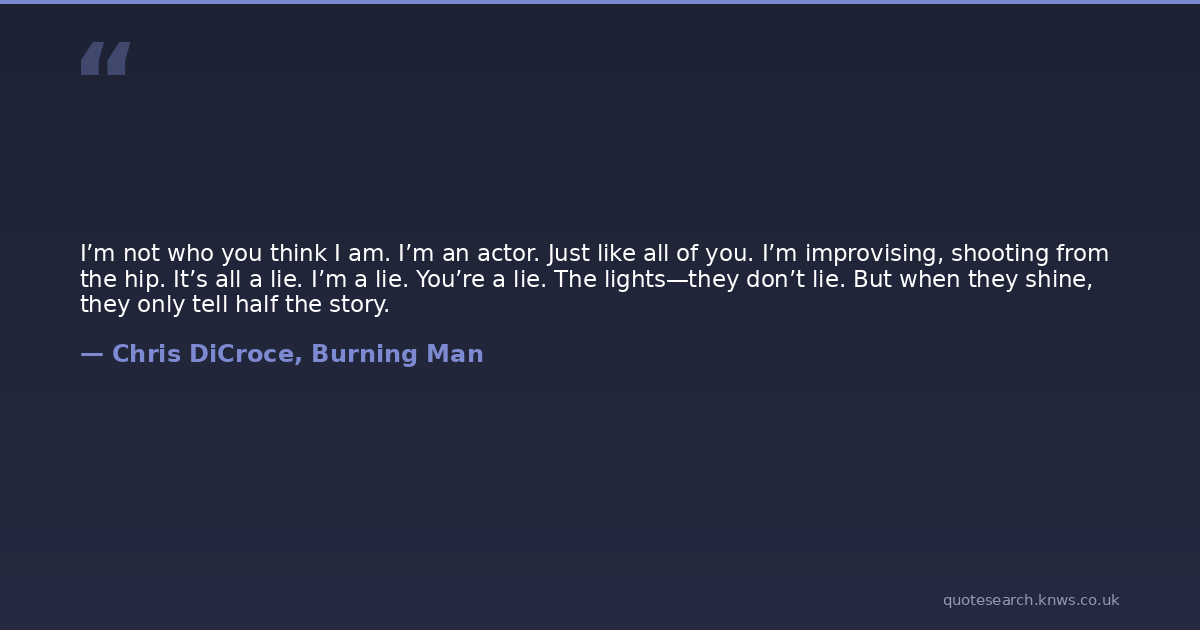 I’m not who you think I am. I’m an actor. Just like all of you. I’m improvising, shooting from the hip. It’s all a lie. I’m a lie. You’re a lie. The lights—they don’t lie. But when they shine, they only tell half the story.