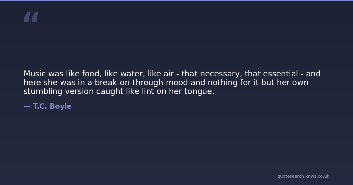 Music was like food, like water, like air - that necessary, that essential - and here she was in a break-on-through mood and nothing for it but her own stumbling version caught like lint on her tongue.