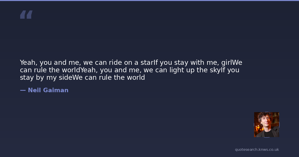 Yeah, you and me, we can ride on a starIf you stay with me, girlWe can rule the worldYeah, you and me, we can light up the skyIf you stay by my sideWe can rule the world