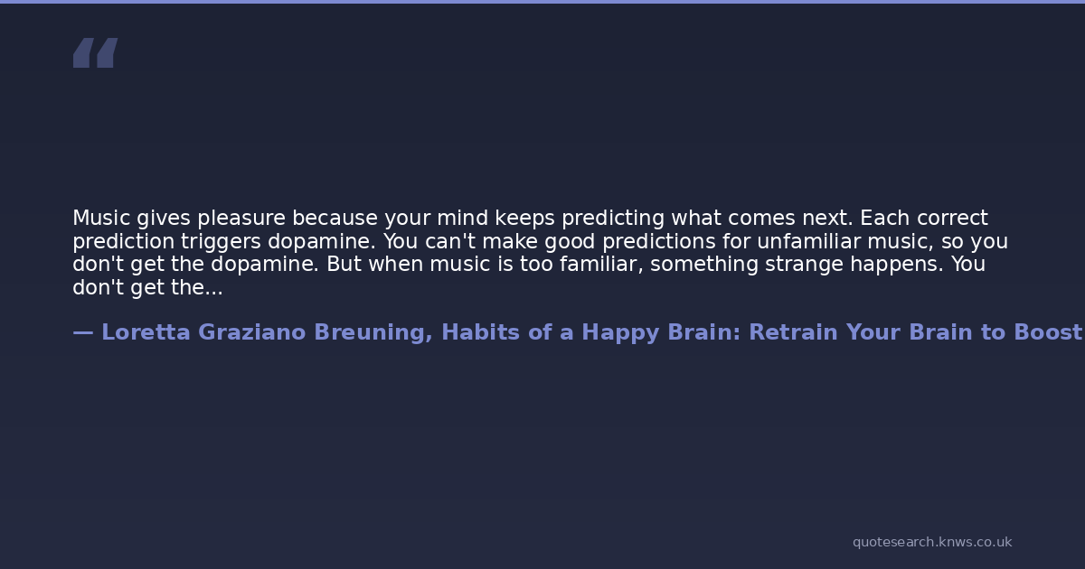 Music gives pleasure because your mind keeps predicting what comes next. Each correct prediction triggers dopamine. You can't make good predictions for unfamiliar music, so you don't get the dopamine. But when music is too familiar, something strange happens. You don't get the dopamine either because your brain predicts it effortlessly. To make you happy, music must be at the sweet spot of novelty and familiarity.