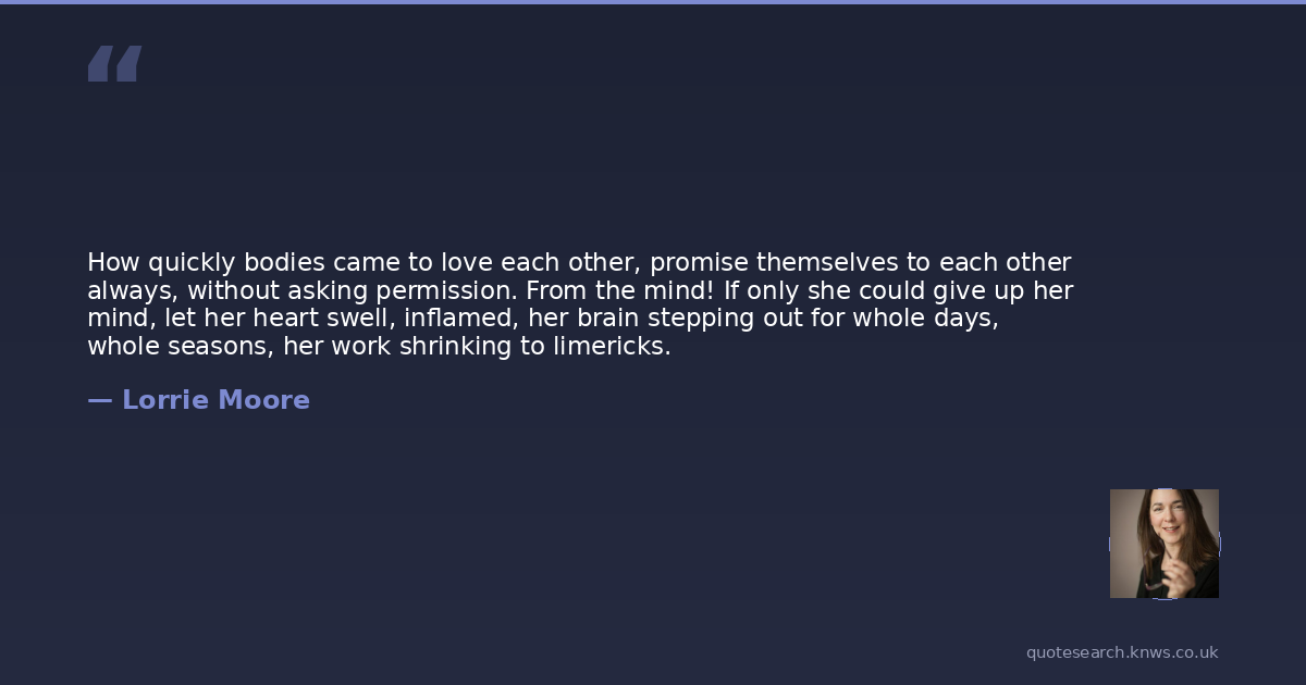 How quickly bodies came to love each other, promise themselves to each other always, without asking permission. From the mind! If only she could give up her mind, let her heart swell, inflamed, her brain stepping out for whole days, whole seasons, her work shrinking to limericks.