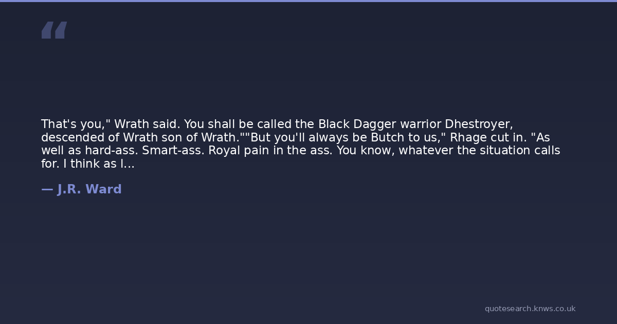 That's you," Wrath said. You shall be called the Black Dagger warrior Dhestroyer, descended of Wrath son of Wrath.""But you'll always be Butch to us," Rhage cut in. "As well as hard-ass. Smart-ass. Royal pain in the ass. You know, whatever the situation calls for. I think as long as there's an ASS in there, it'll be accurate.""How about bASStard?" Z suggested."Nice. I feel that.