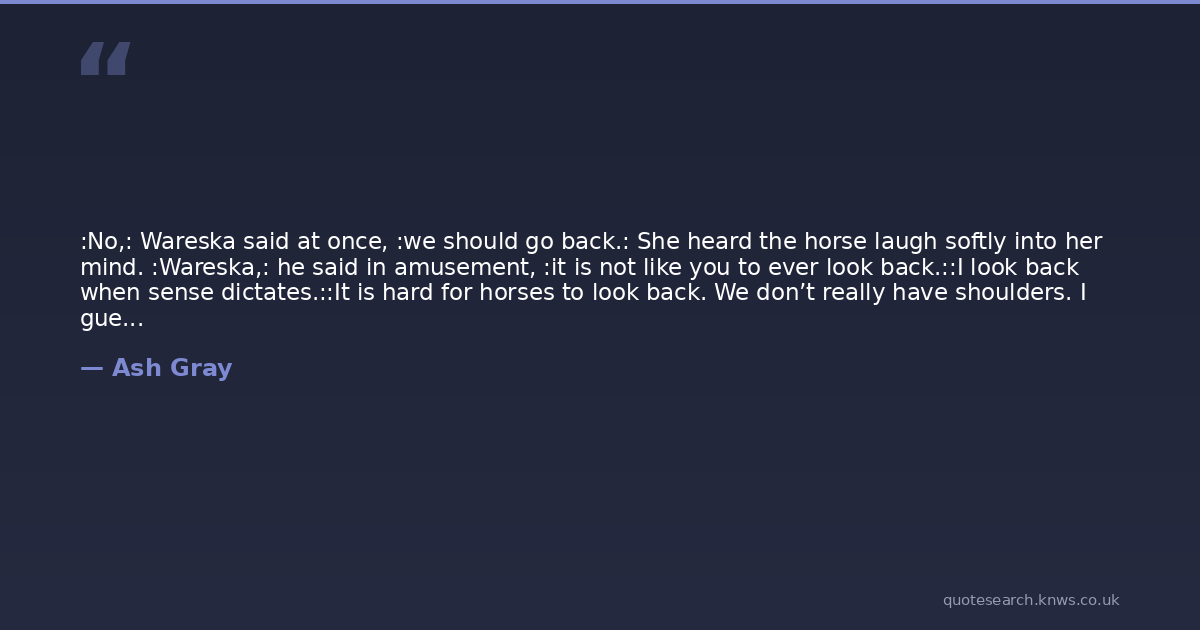 :No,: Wareska said at once, :we should go back.: She heard the horse laugh softly into her mind. :Wareska,: he said in amusement, :it is not like you to ever look back.::I look back when sense dictates.::It is hard for horses to look back. We don’t really have shoulders. I guess we look back over our butt?: