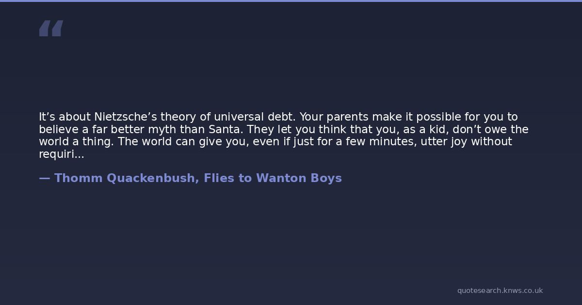 It’s about Nietzsche’s theory of universal debt. Your parents make it possible for you to believe a far better myth than Santa. They let you think that you, as a kid, don’t owe the world a thing. The world can give you, even if just for a few minutes, utter joy without requiring anything from you. It’s not about consumerism. As far as you know, no one buys you these presents. They come out of nothingness, with fantasies of elves attached. You aren’t required to be grateful to your parents or anything like that. They can give to you and nothing is required in return. When you get old enough, when you have kids, you get to enact this myth for them. It has nothing to do with any fat man in a red suit, no matter what we tell ourselves. It’s about owing nothing, and then realizing that you have to do this job of perpetuating this… this fantasy world, whether you like it or not.