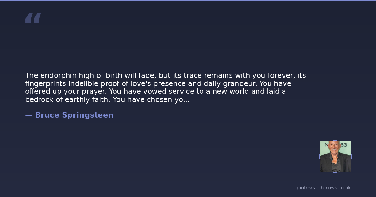 The endorphin high of birth will fade, but its trace remains with you forever, its fingerprints indelible proof of love's presence and daily grandeur. You have offered up your prayer. You have vowed service to a new world and laid a bedrock of earthly faith. You have chosen your sword, your shield, and where you will fall. Whatever the morrow brings, these things, these people, will be with you always. The power of choice, of a life, a lover, a place to stand, will be there to be called upon and make fresh sense of your tangled history. More important, it will also be there when you waver, when you're lost, providing you with the elements of a new compass, encased within your heart.